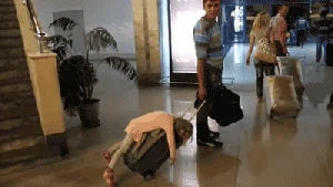 via GIPHYVideo gif. In the lobby of a busy hotel, a man rolls his luggage with a little girl dead asleep laying on top of it. He just looks at her and then keeps moving, wondering if she’ll ever wake up.See more tired GIFs